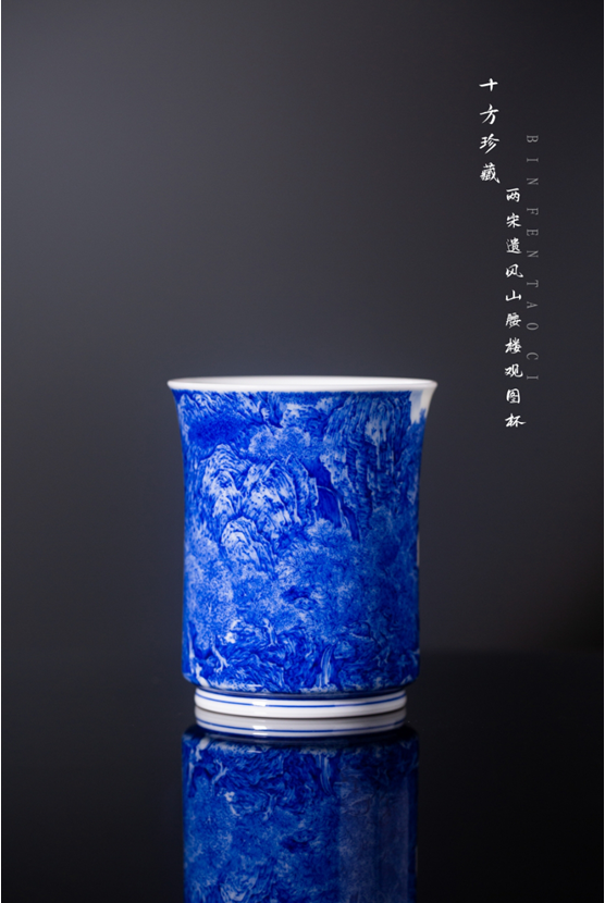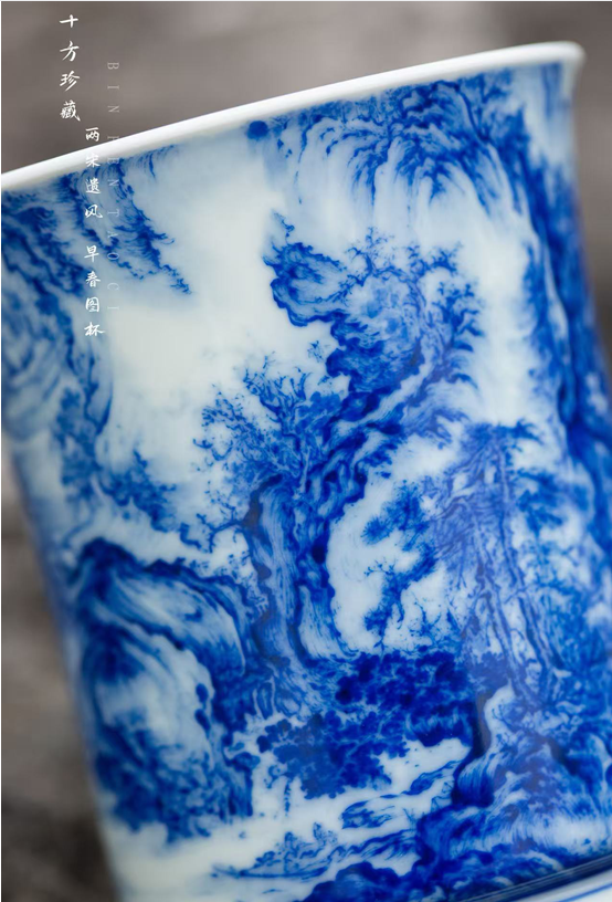 十方珍藏的窑主章标,在将中国顶尖山水画走进青花瓷的时候,并不是根据市场的需求或者自己的喜好进行随性复刻。而是遵循中国山水画的发展,从隋唐到五代十国,再到宋、元、明、清的山水画变化,将其按照十方珍藏的青花山水系列,进行一对一的元素提取,然后在青花瓷上进行展现。